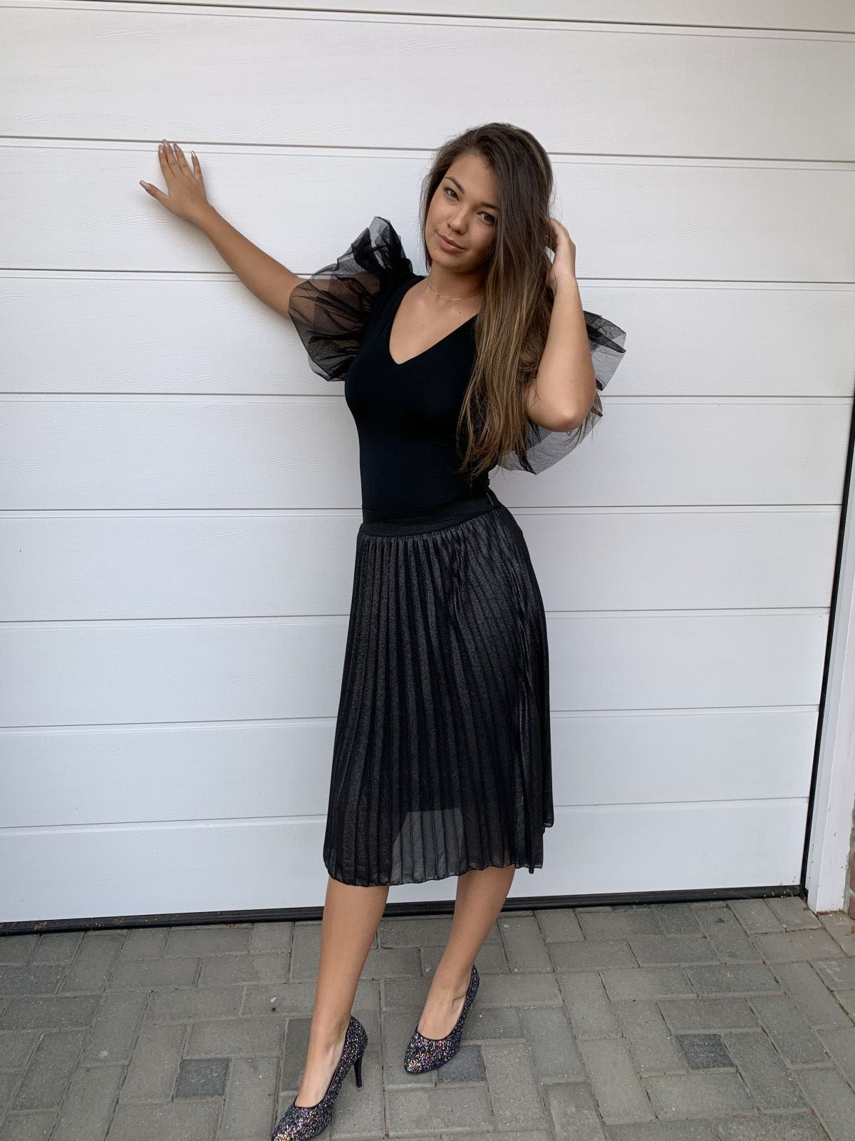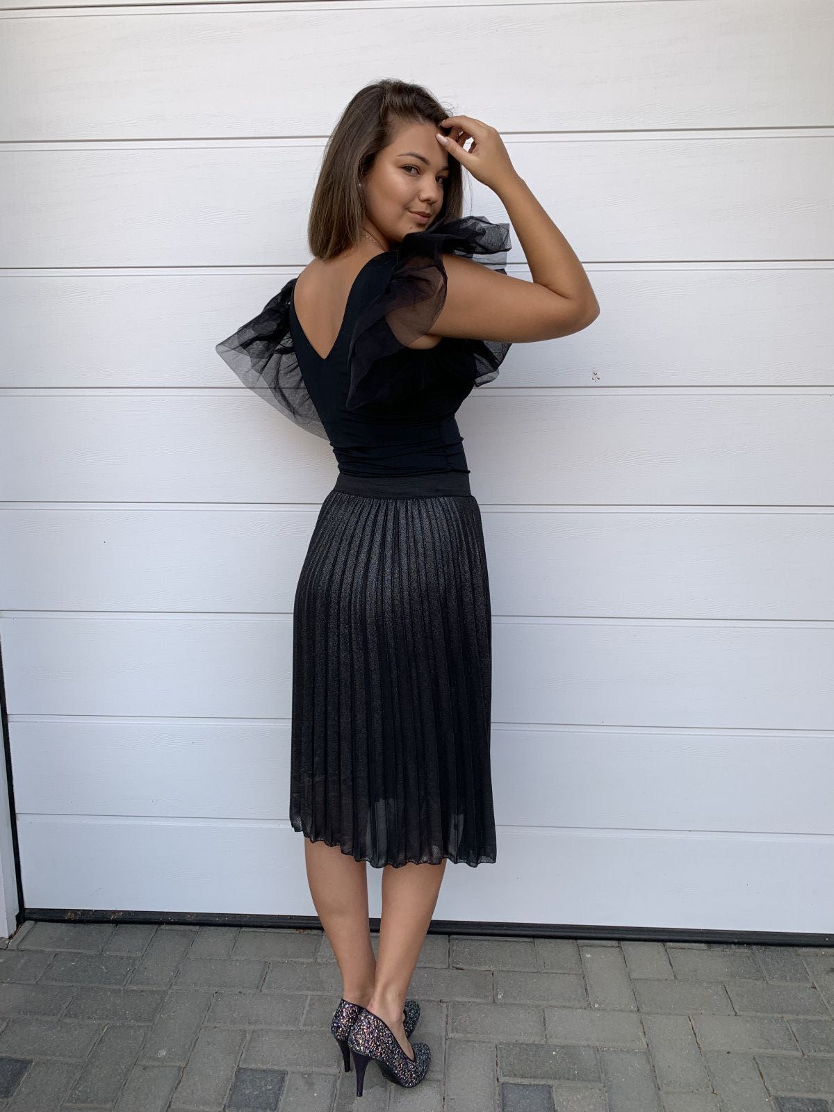 Glittery egyméretes rakott szoknya, amelyet S-L méretig ajánljuk.