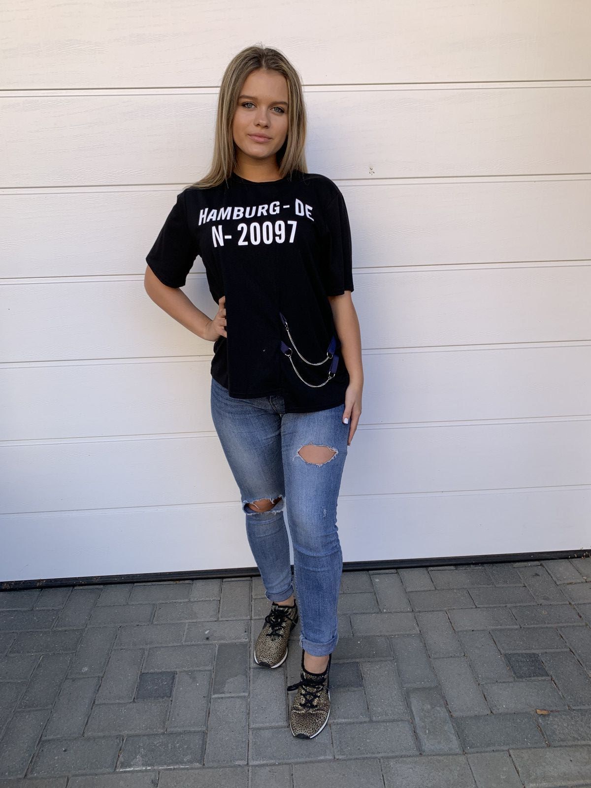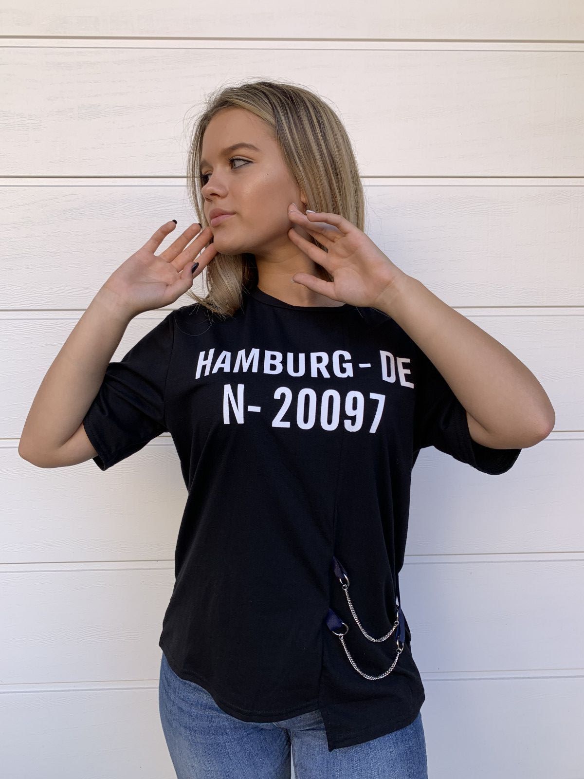 Hamburg egyméretes fekete láncos póló, amelyet bátran ajánljuk S-L méretig.