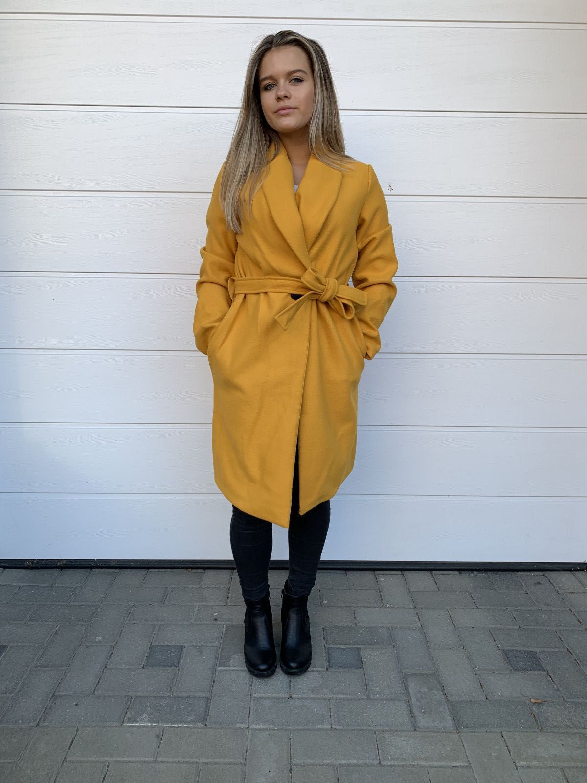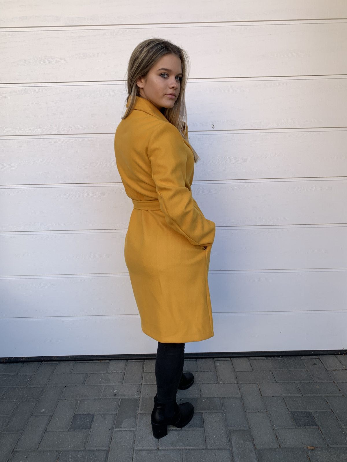 Irina egyméretes mustár szövetkabát, amelyet S-M méretig ajánljuk.