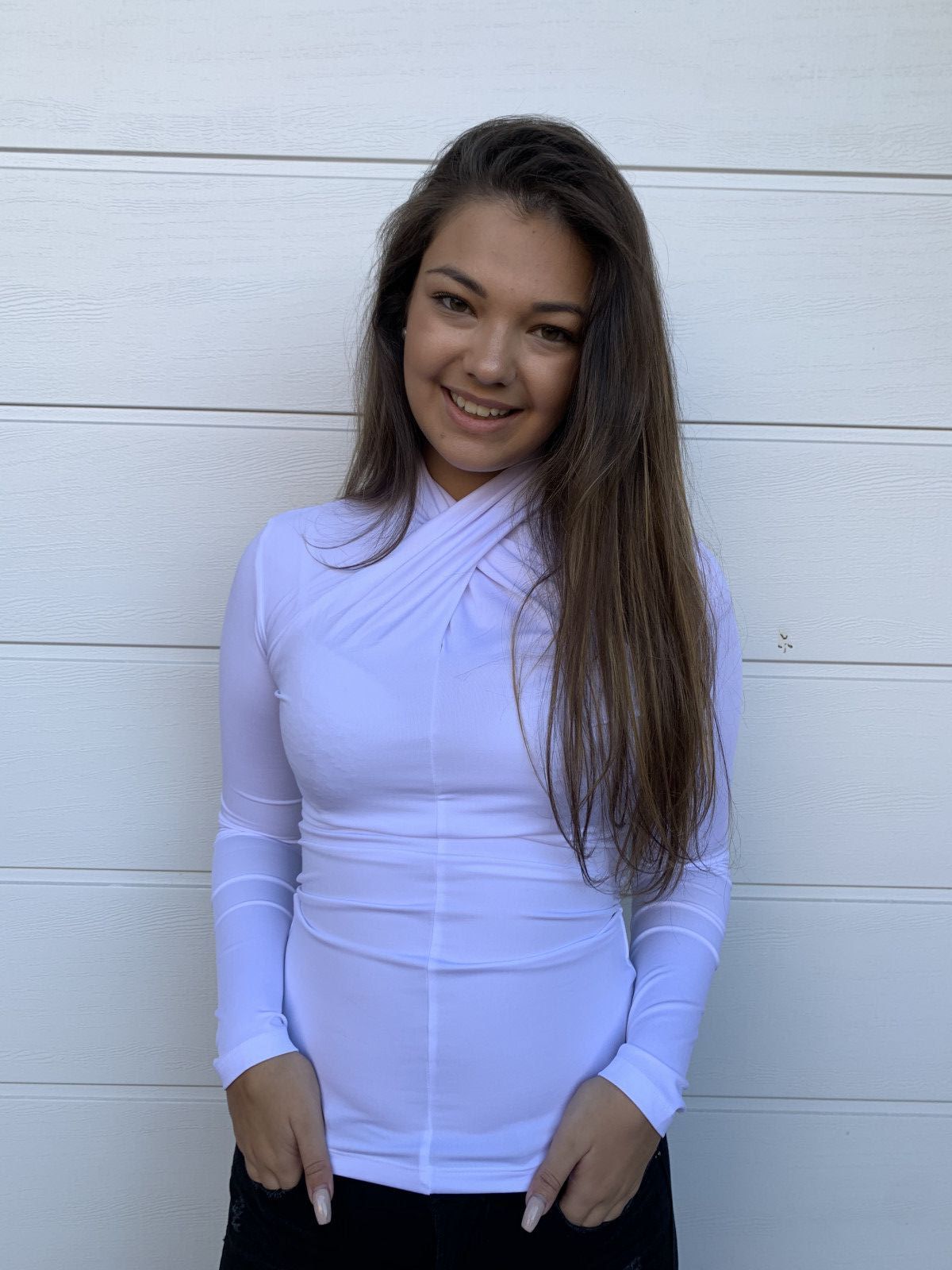 Kiki egyméretes csavart nyakú felső, amelyet S-L méretig ajánljuk.