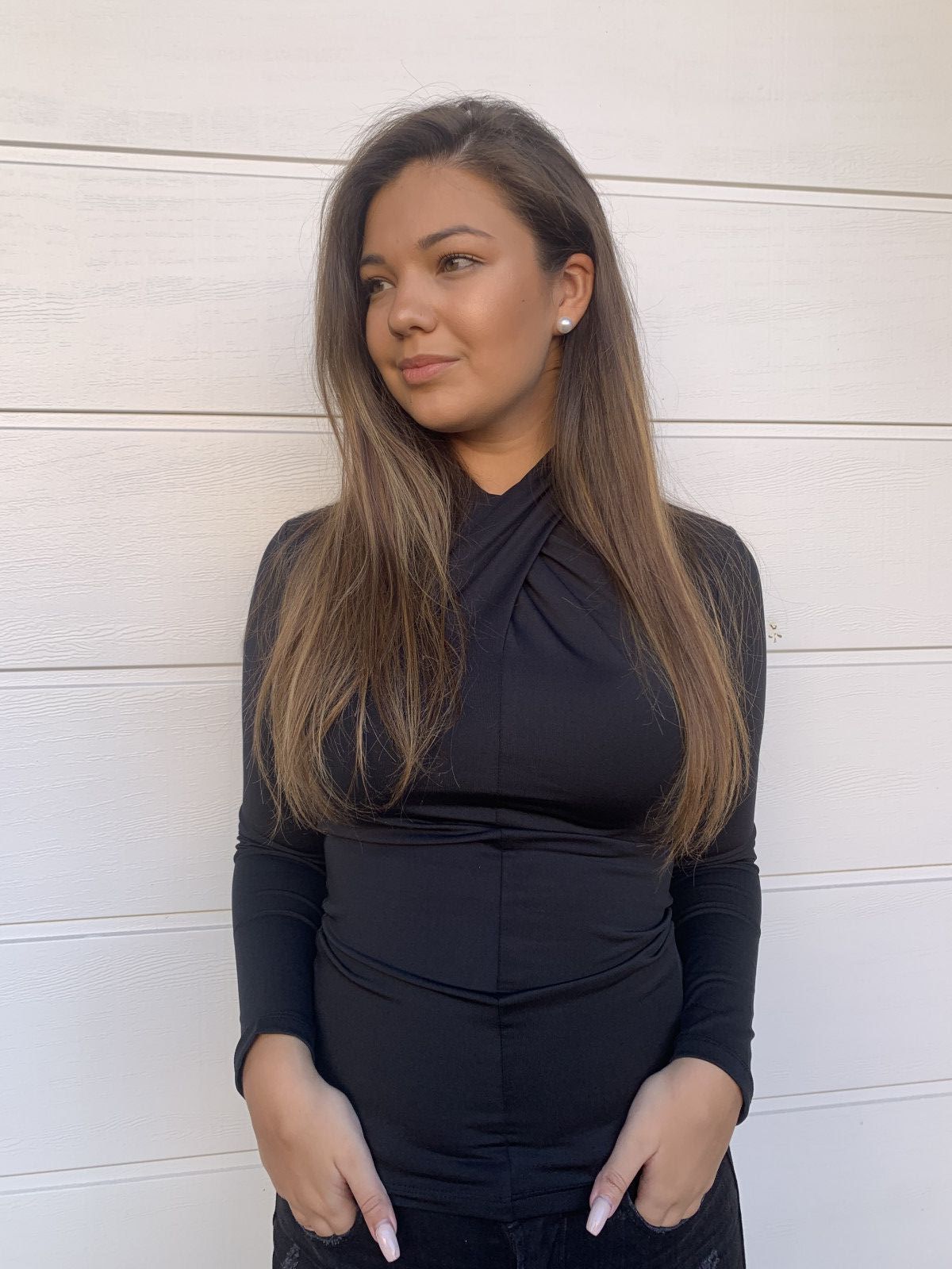 Kiki egyméretes fekete felső, amelyet S-L méretig ajánljuk.
