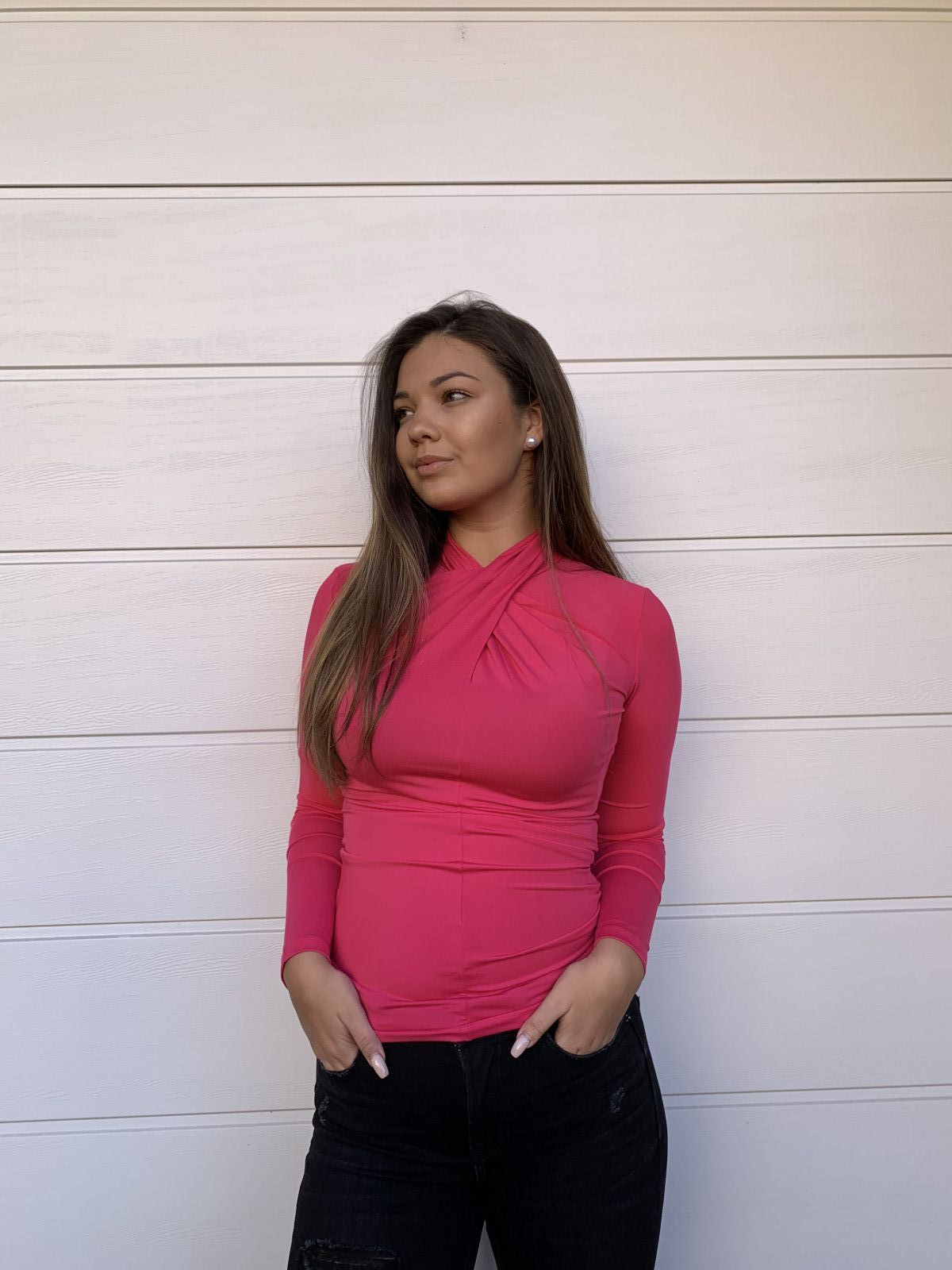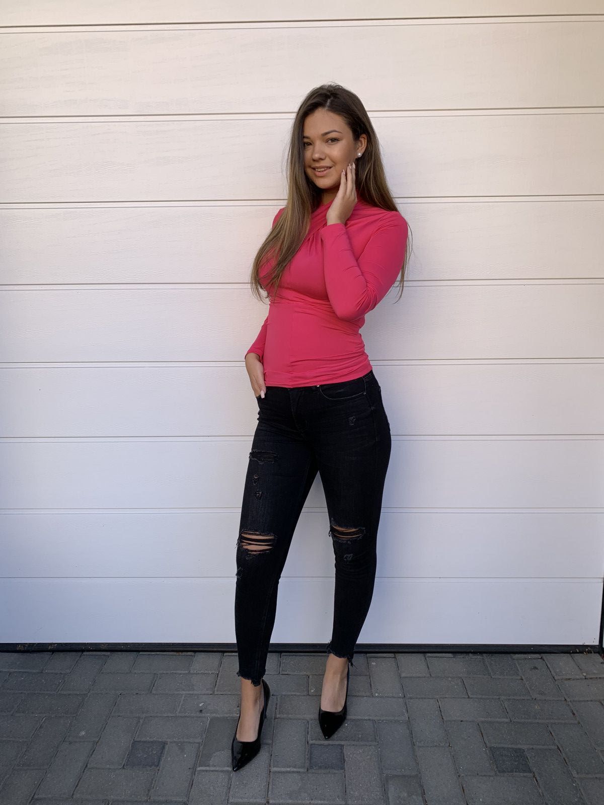 Kiki egyméretes pink felső, amelyet S-L méretig ajánljuk.