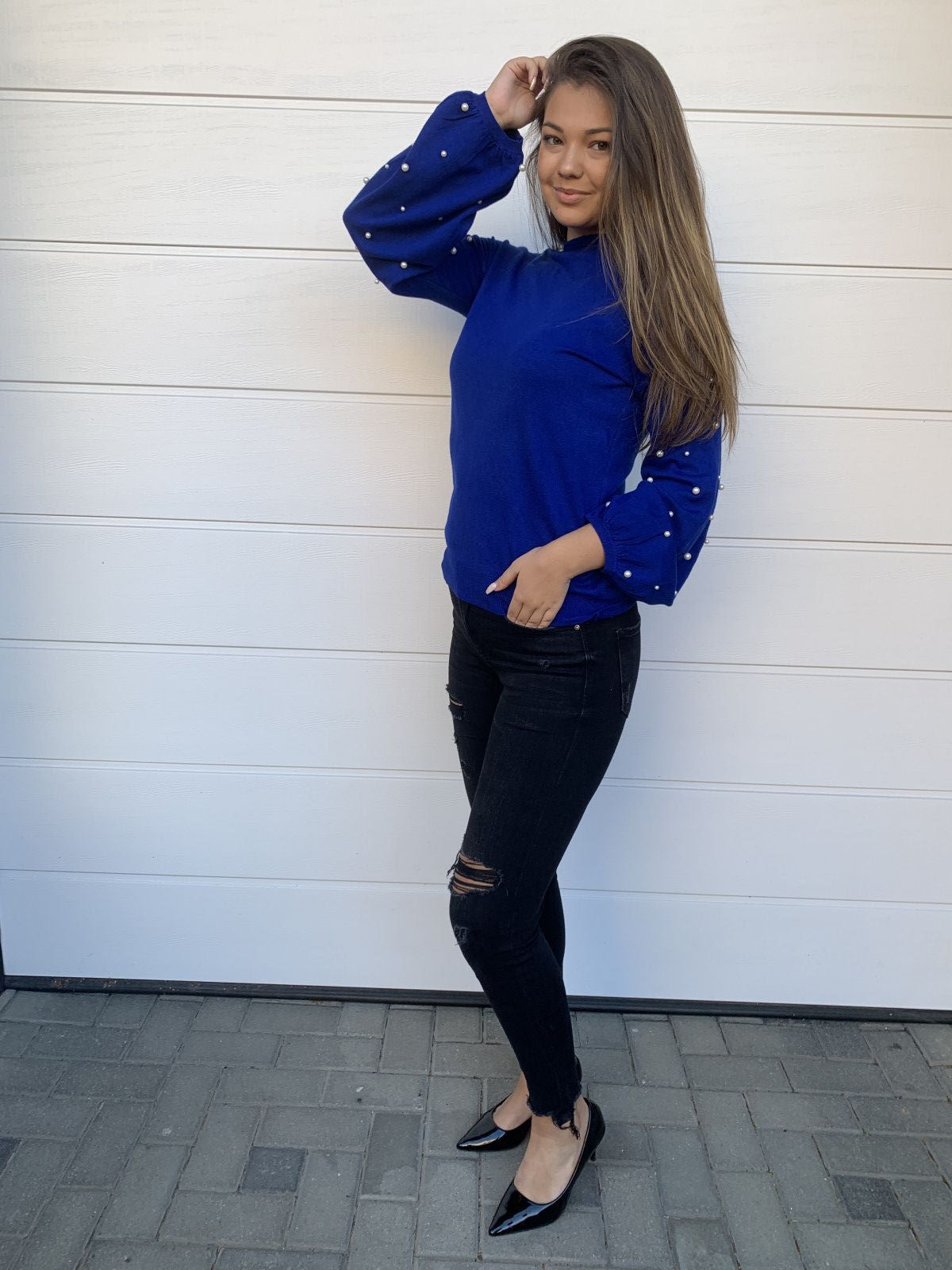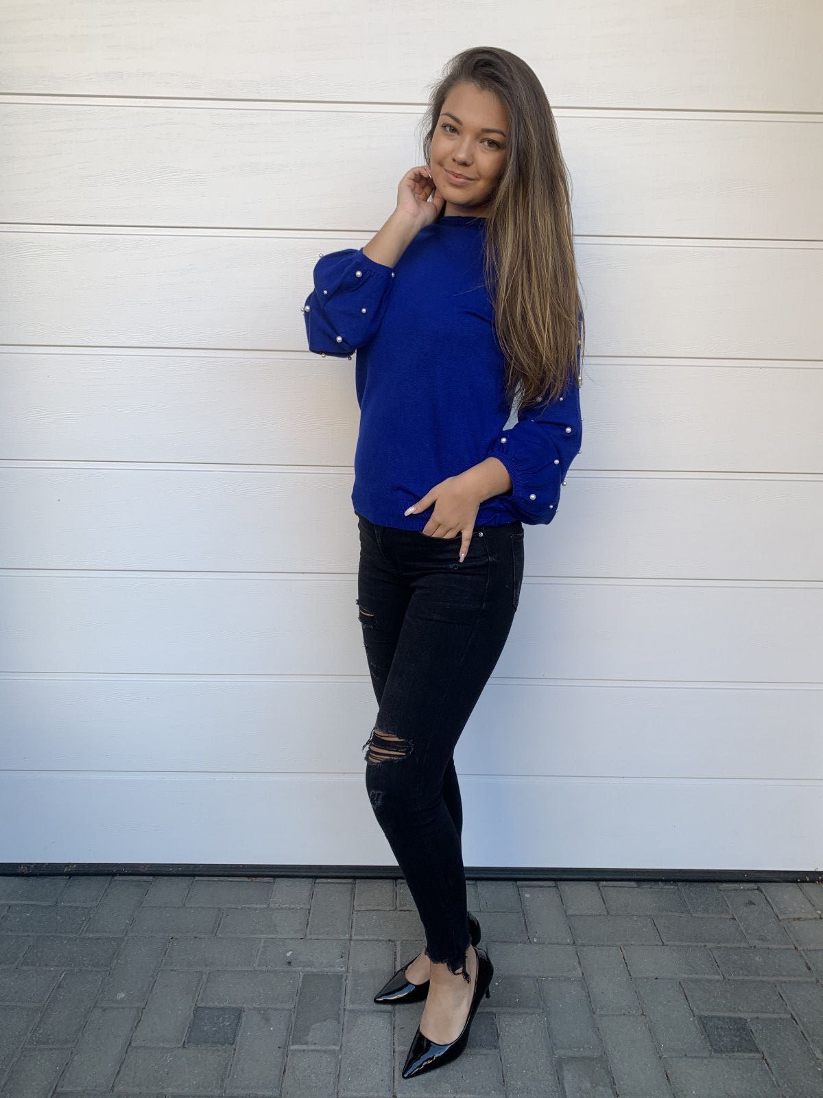 Lora kék egyméretes pulcsi, amelyet bátran ajánljuk S-L méretig.